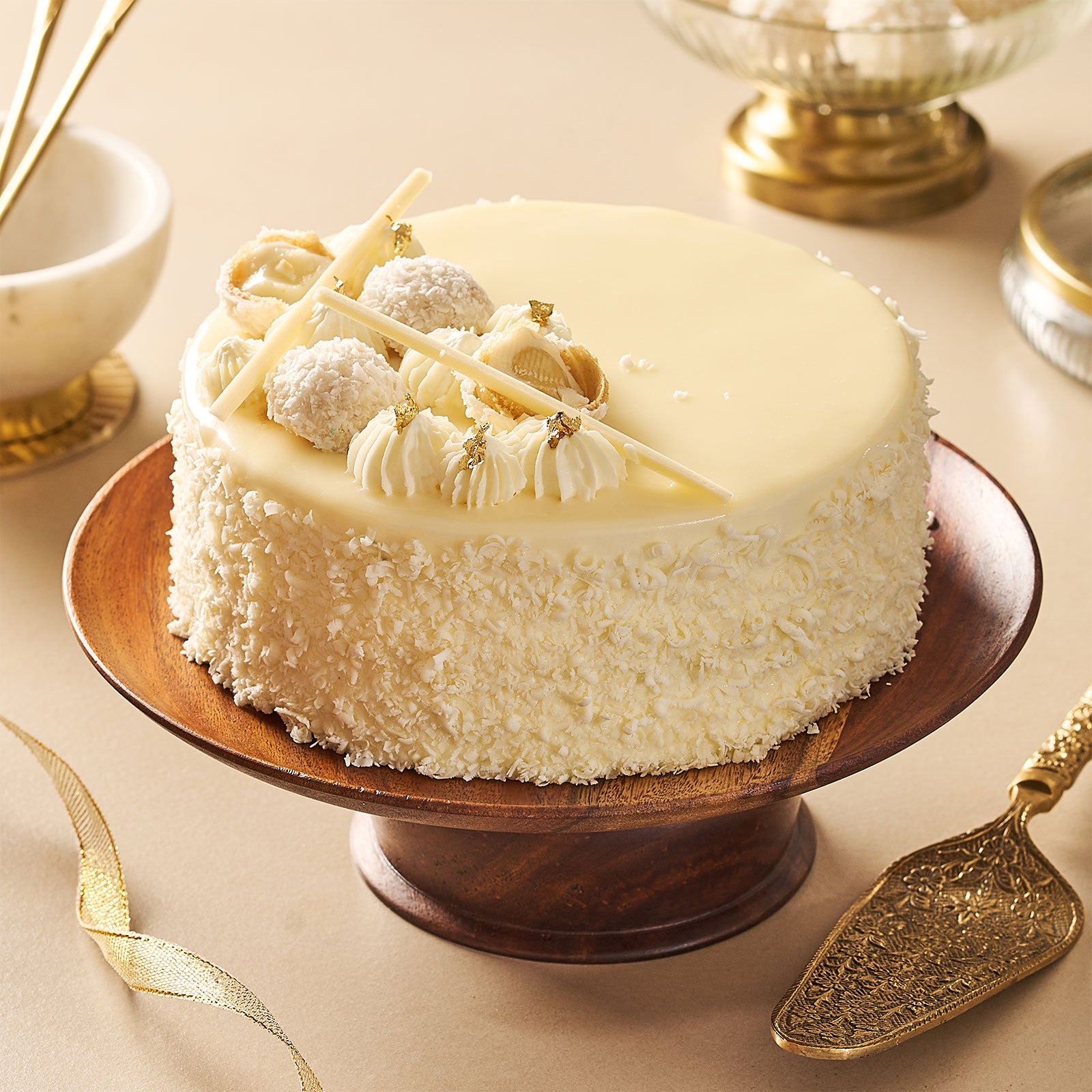 An airy vanilla chiffon enriched with vanilla milk and crowned with elegant white chocolate ganache